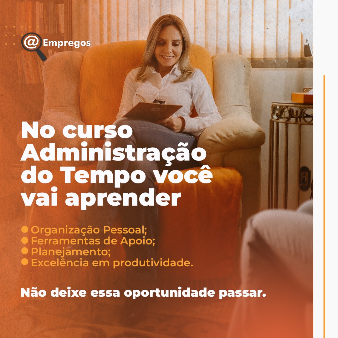 Organização pessoal, Ferramentas de Apoio, Planejamento, vão construir excelência em sua produtividade. Isso e muito mais, é o que você verá e vivenciará no Curso Administração do Tempo.